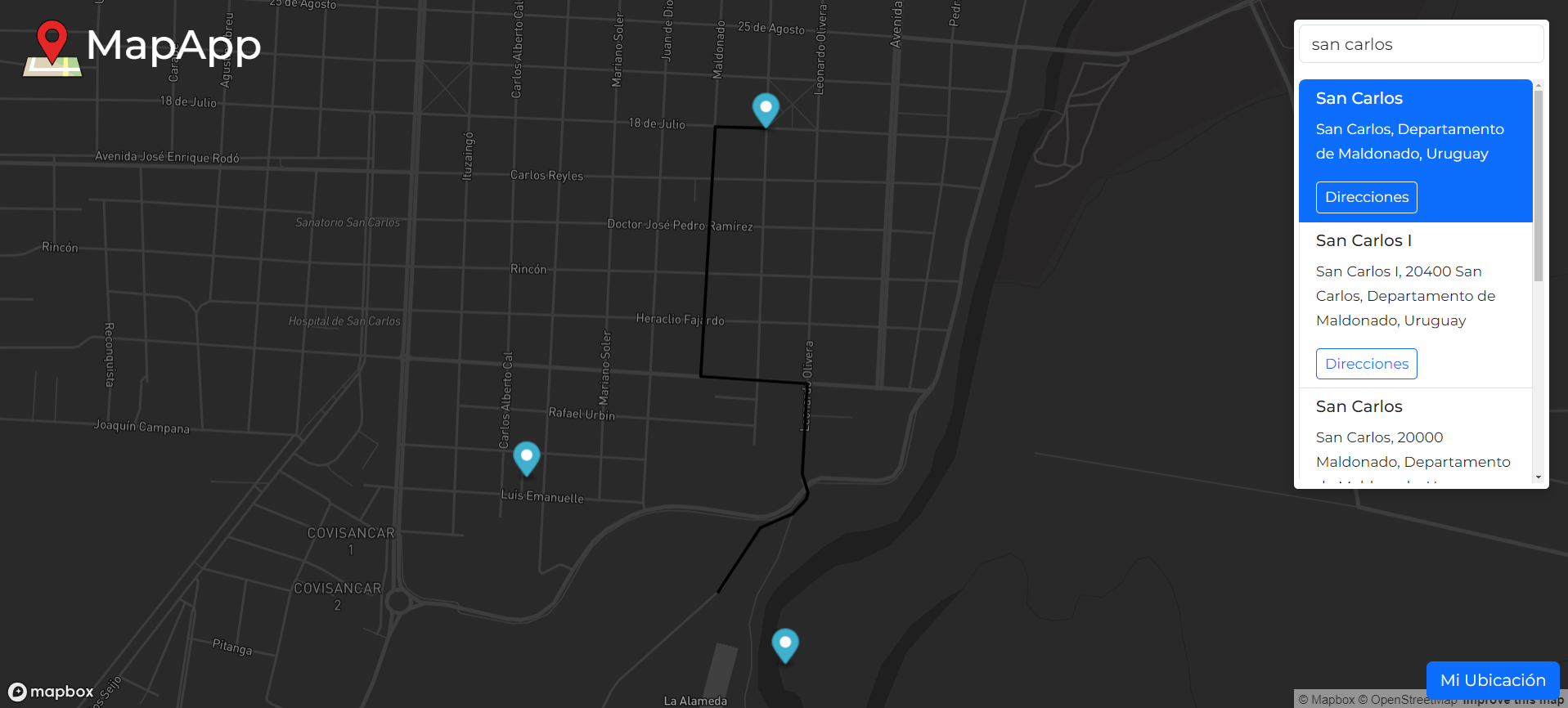 Map application for searching locations and tracing routes between two places. This map application was created using Bootstrap, React technologies and we use useContext to maintain the application state, in addition we consume the Mapbox API which we use to display the map, pins and routes.